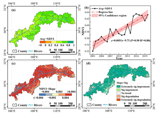 Spatial distributions of NDVI and its changing trends for the TGR area from 2001 to 2020: (a) twenty–year annual mean NDVI, (b) inter–annual variations in the NDVI from 2001 to 2020, (c) the spatial distributions of the trends in NDVI changes at pixel scale, and (d) significant (p–value < 0.05) trends in NDVI changes at pixel scale.