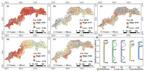 The Pearson correlation between NDVI and its driving factors. (a–e) show the spatial distribution of Pearson correlation between NDVI with GDP, MCD, Pd, Pre, and Tem, respectively, and (f) shows the box plots of Pearson correlation coefficients with p < 0.05.