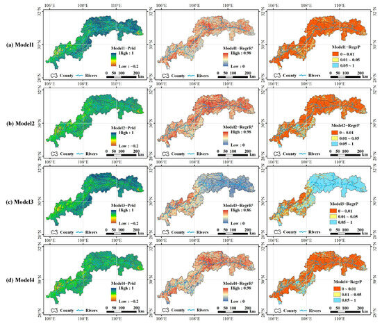 To verify the feasibility of our zoning combination method, we designed four regression models for comparison: Models 1, 2, 3, and 4. Model 1 represented the proposed method. Model 2 assumed that both human activities and climate change affect vegetation cover, with all influencing factors as independent variables. Models 3 and 4 assumed that either climate change or human activities impact regional vegetation changes, with climate change and human activity factors as the independent variables in the regression model, respectively.