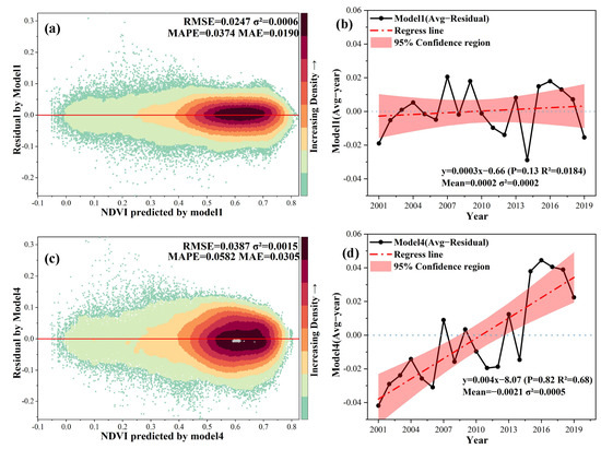 Finally, due to the spatial heterogeneity of human activities and climate change, we analyzed the residuals of Models 1 and 4 (Figure 8). The Root Mean Square Error (RMSE) was 0.0247 ( = 0.0006), Mean Absolute Percentage Error (MAPE) was 0.0374, and Mean Absolute Error (MAE) was 0.0190 for Model 1. The RMSE was 0.0387 ( = 0.0015), MAPE was 0.0582, and MAE was 0.0305 for Model 4. Furthermore, from 2001 to 2019, the annual residual of Model 4 exhibited a significantly increasing trend (Figure 8d). This suggests that Model 4 is not temporally stable. On the other hand, the annual residuals from 2001 to 2019 by Model 1 were randomly distributed, with no significant changing trends.