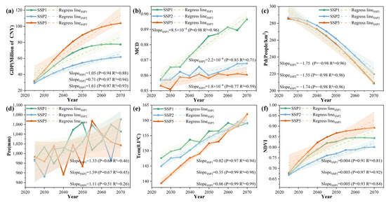 Future temporal changes in (a) GDP, (b) MCD, (c) Pd, (d) Pre, (e) Tem, and (f) the simulated changes in NDVI from 2021 to 2070 under SSP1–2.6, SSP2–4.5, and SSP5–8.5 in the TGR area.