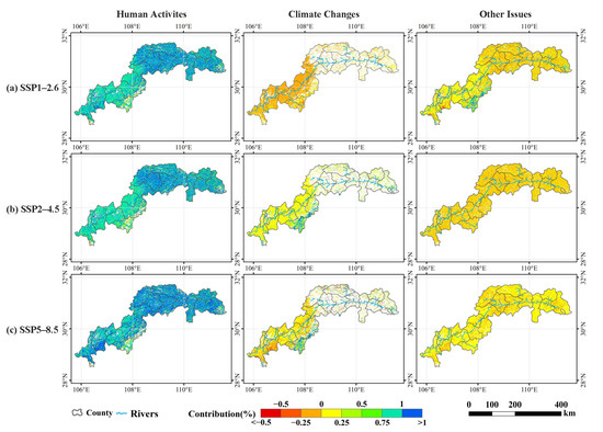 For Pre and Tem in the TGR area, both show a trend of fluctuating growth (Figure 10d,e). This indicates that the fluctuation in rainfall over the next 50 years may be relatively large, and as a result, the overall temporal change trend may not be significant. In contrast, Tem has a strong positive correlation with time changes in the future. We estimated that, in the next 50 years, the annual mean temperature of the region could increase by 1.15 °C, 1.40 °C, and 2.26 °C under SSP1–2.6, SSP2–4.5, and SSP5–8.5, respectively.