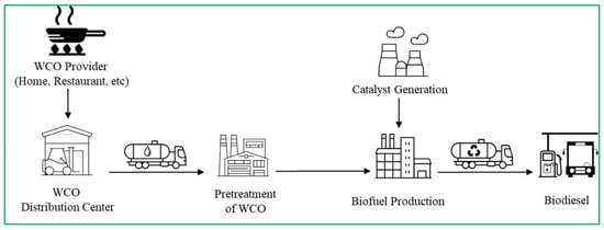 Moreover, WCO’s recovery and transformation align with circular economy principles, emphasizing resource reuse and circularity [49,50]. This is because the WCO business model achieves a closed-loop system, resulting in cost-effectiveness and economic benefits [51]. For example, projects like RecOil in Europe demonstrate the economic and environmental benefits of this model [52]. Efficient WCO management aligns with sustainable development goals and offers business opportunities [53].
