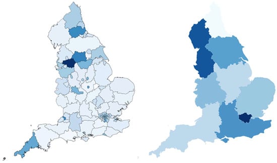 Regarding the supply side, the UK’s domestic WCO mainly comes from food manufacturers and restaurants, with a significant portion being collected in the England region [7,60]. Among these, fast-food outlets are considered to be the largest contributors. Therefore, the number of fast-food outlets in a region can likely influence the WCO output in that area [5]. According to data from Public Health England [6], Greater London (8662), North West (7533), and South East (6092) have the highest number of fast-food outlets in England. Furthermore, Birmingham (1058), Leeds (966), and Manchester (752) are the top three cities with the most fast-food outlets, resulting in a higher concentration of WCO in these regions, as shown in Figure 2, where darker colours represent more fast-food outlets in the area.