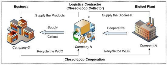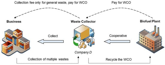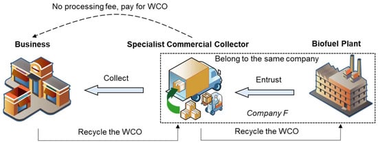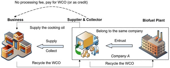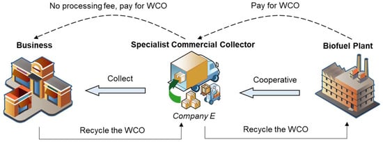 Company A is a nationwide company in the UK, supplying virgin oil and recycling the WCO. It operates the largest biorefinery in the UK, specializing in the conversion and sale of biodiesel. As a supplier and collector, its recycling model is shown in Figure 4. With its own logistics fleet and biofuel plant, Company A operates under the BET model. Under this model, Company A provides businesses with rewards based on the amount of WCO they provide. If a business also chooses to purchase virgin oil from Company A, these incentives can be used to offset the cost. The collected WCO is sent to the plant to be converted into biofuel.