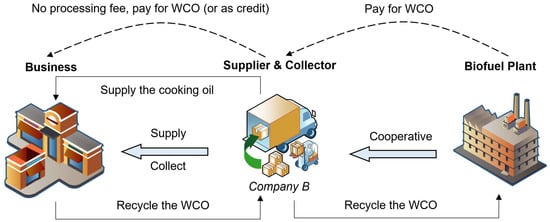 Company B is a family-run business serving mainly the England area. As a supplier and collector, its recycling model is shown in Figure 5. Acting as an intermediary between businesses and biofuel plants, Company B adopts the TPT model, a commonly utilized model in the UK. Company B purifies the WCO before sending it to a third-party biofuel plant.