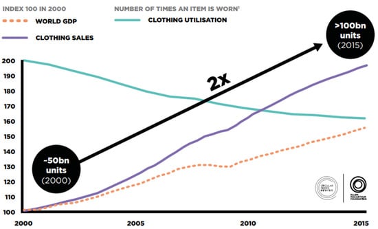Growth of clothing sales and decline in the utilization of clothing between 2000 and 2015. Reproduced with permission from [6]. Copyright 2017 Ellen MacArthur Foundation. As of 2015, sales of clothing have approximately doubled, and the utilization of clothing (i.e., 1 the average number of times a garment is worn before it ceases to be used) has decreased by 36% since 2000. The index sets the initial value of the data series to 100 in 2000. The other index values in this data series are based on the difference of each data value to the initial value. GDP denotes gross domestic product. GDP is a measure of the size of an economy. It measures the value of the total final output of goods and services produced by that economy in a certain period of time.