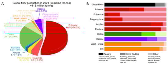 (A): Overview of the global fiber production in 2021 (in million tons) and (B) the amount of fiber used in various applications. Reproduced with permission from [21]. Copyright 2023, Elsevier.