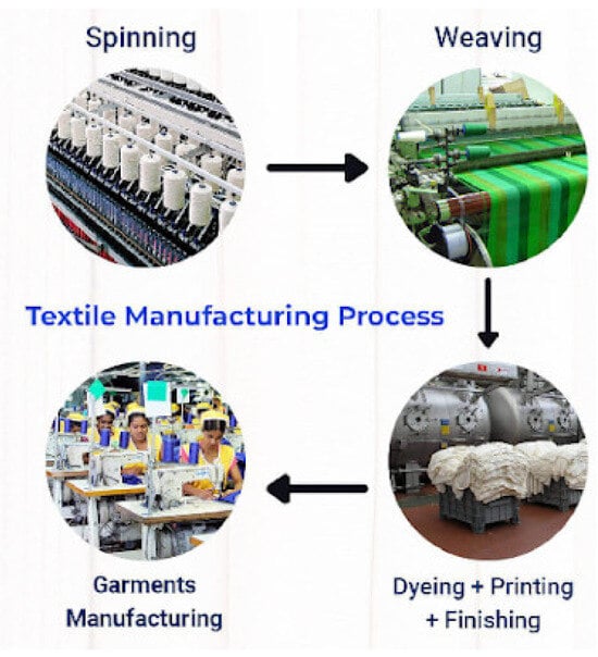 - Mdmustafiz. A Journey through the Textile Manufacturing Process. 2023. Available online: https://medium.com/@mdmustafiz898/a-journey-through-the-textile-manufacturing-process-5650d4cf0998 (accessed on 11 July 2024).