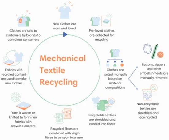 Mechanical textile recycling is the process of recycling textiles into fibers without using any chemicals. Mechanical recycling involves mechanical processes such as unraveling, garneting, ripping, cutting, grinding, etc. Mechanical recycling allows the material from textile waste to be reused and turned into new raw materials, without breaking down the polymer chains that make up the fibers. This differentiates it from chemical recycling methods [23,35,47]. Prior to shredding fabrics into smaller pieces, hardware components like zippers and buttons must be taken off. As the fabrics are made of fibers, mechanical recycling involves tearing and loosening the fabrics to break them down into fibers (the tearing machine comprises high-speed rotating cylinders or drums lined with saw wires or steel pins, which tear the textile apart, opening up its structure and releasing individual fibers) [48], combining those fibers with a certain amount of original fiber, re-spinning them into yarn, weaving or knitting recycled fabrics, and finally producing recycled apparel [49]. Figure 9 presents an overview of the mechanical recycling of textiles.