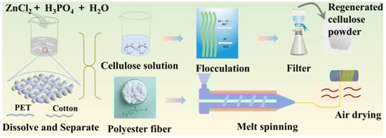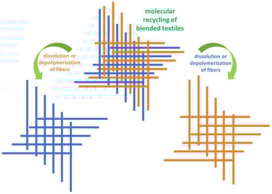 Solely employing mechanical techniques is often inadequate for unraveling and segregating the intricate intermingling between cotton and polyester fibers present within polycotton blends. The distinct chemical compositions of cotton (composed of about 95% cellulose) and polyester enable their efficient separation via either physical dissolution or depolymerization of one component through chemical recycling, while preserving the other as intact fibrous material as shown in Figure 10 [33].