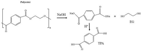 - Bengtsson, J.; Peterson, A.; Idstrom, A.; de la Motte, H.; Jedvert, K. Chemical Recycling of a Textile Blend from Polyester and Viscose, Part II: Mechanism and Reactivity during Alkaline Hydrolysis of Textile Polyester. Sustainability 2022, 14, 6911. [Google Scholar] [CrossRef]