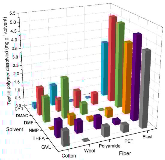 - Vonbruel, L.; Cordin, M.; Manian, A.P.; Bechtold, T.; Pham, T. Solvent blends for selective elastane dissolution and recovery from mixed polyamide fabrics. Resour. Conserv. Recycl. 2024, 200, 107302. [Google Scholar] [CrossRef]