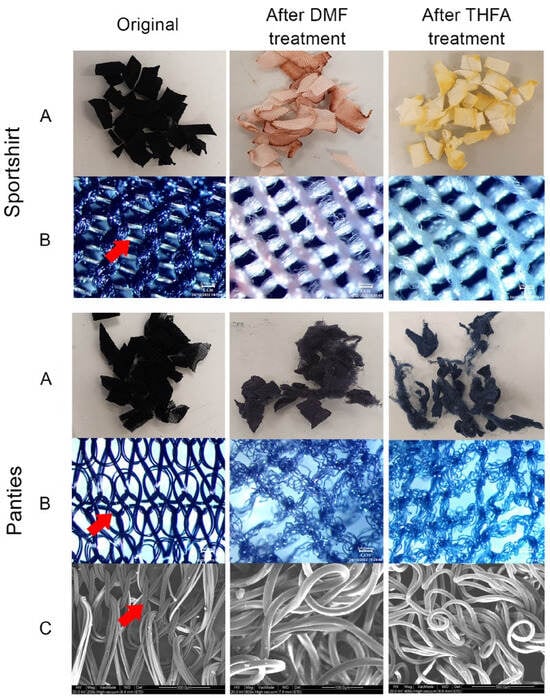 Blended fabrics can be recycled with chemical, physical, and biological processes, utilizing dissolution, hydrothermal processes, and enzymatic processes [22,23,35]. The separation of blends guarantees that the distinctive qualities of every material can be preserved and successfully used in new products by recycling each one separately. The separation of cotton from polyester in blended fabrics can be achieved with various methods, including selective dissolution using solvents and ionic liquids, enzymatic hydrolysis, alkaline pretreatment, and hydrothermal treatment. The separation of elastane can be achieved by its selective dissolution or degradation. Ultimately, these processes offer promising pathways for recycling and repurposing blended textiles, which contributes to sustainable textile practices.