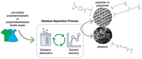 - Boschmeier, E.; Archodoulaki, V.-M.; Schwaighofer, A.; Lendl, B.; Ipsmiller, W.; Bartl, A. New separation process for elastane from polyester/elastane and polyamide/elastane textile waste. Resour. Conserv. Recycl. 2023, 198, 107215. [Google Scholar] [CrossRef]