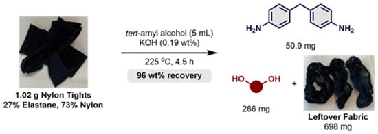 - Johansen, M.B.; Donslund, B.S.; Henriksen, M.L.; Kristensen, S.K.; Skrydstrup, T. Selective chemical disassembly of elastane fibres and polyurethane coatings in textiles. Green Chem. 2023, 25, 10622–10629. [Google Scholar] [CrossRef]