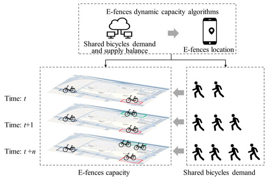 The sustainable dynamic capacity of e-fence problem involves planning the open capacity of each e-fence for each time unit based on the temporal and spatial usage characteristics of bike sharing. The problem schematic is illustrated in Figure 1. During the dynamic time period, the locations of bike-sharing e-fences can be designed and planned using our methodology to adjust the area of the e-fence according to user demand for borrowing and returning bicycles. Users borrow and return bicycles at designated locations through a mobile app. For instance, there are three e-fences within the same parcel of land. During period t + n, when user demand is high, the area of the e-fence is increased accordingly. Conversely, during period t, when user demand is lower, the area of the e-fence is decreased. This dynamic adjustment not only saves land resources but also improves the utilization rate of bike-sharing e-fences. During peak times, the capacity of the e-fence is expanded to better meet user demand by increasing the site area. During off-peak times, the open capacity is reduced to release excess space, thereby lowering maintenance and management costs. This approach makes the sustainable e-fence system more flexible and better able to adapt to changes in user demand.