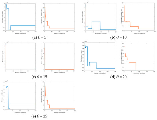 When the initial number of bike-sharing instances placed in the region is five, the algorithm iteration convergence curve is shown in Figure 4a. Convergence begins at the 34th iteration and stabilizes until reaching the maximum of 200 iterations; at this point, the enterprise cost is approximately 95,000 CNY, and users are required to walk an extra 17.5 m. Similarly, when the initial number of bike-sharing instances is 10, as shown in Figure 4b, convergence starts at the 96th iteration and stabilizes until the maximum of 200 iterations. At this point, the enterprise cost is about 113,000 CNY, and users are required to walk an extra 17.3 m. For an initial placement of 15 bikes, the convergence curve in Figure 4c shows that convergence begins at the 3rd iteration and stabilizes at the maximum of 200 iterations, with an enterprise cost of around 106,000 CNY and an extra walking distance of 17 m. When the initial placement is 20 bikes, as depicted in Figure 4d, the optimal value begins to converge at the 79th iteration and levels off at 200 iterations, with a cost of about 76,000 CNY and an extra walking distance of 15.1 m for users. Finally, with 25 bikes initially placed, shown in Figure 4e, convergence starts at the 34th iteration and stabilizes at 200 iterations, resulting in an enterprise cost of approximately 96,000 CNY and an extra walking distance of 17.3 m for users.