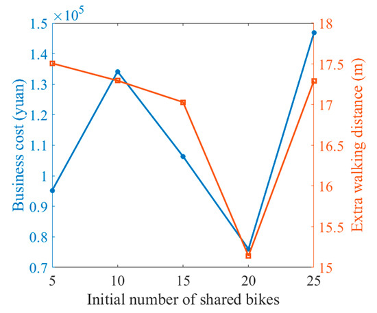 Following these five finalized results with varying θ values, simulation-based heuristics were performed to determine the optimal initial number of bike-sharing instances. The results are illustrated in Figure 5. It is worth noting that for θ = 20, in the planned deployment of the e-fence in the study area, the business cost is approximately 76,000 CNY (blue line in Figure 5), and the extra walking distance for the user is 15.1 m (orange line in Figure 5).