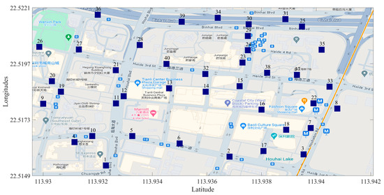 Based on the optimal initial number of bike-sharing instances identified in Section 5.2, we have calculated the distribution planning and dynamic capacity of e-fences over a 24 h period. Utilizing the solution algorithm outlined in Section 4, we determined that 40 e-fence sites are optimal. The distribution of these sites is depicted in Figure 6. This distribution is closely aligned with bike-sharing usage patterns, ensuring efficient bike-sharing operations and urban mobility. In contrast, the absence of e-fences results in the disorderly parking of bicycles, often obstructing sidewalks, subway entrances/exits, and shopping malls. Such disorderly parking infringes upon vehicular traffic rights, obstructs pedestrian pathways, and diminishes the availability of bicycles for subsequent users. Our rationally planned e-fence sites are strategically located in high-demand areas, including residential zones (stations 1, 2, 4, 9, 19, 20, etc.), commercial districts (stations 16, 17, 18, etc.), educational institutions (stations 6, 25, 35), subway stations (stations 3, 7, 8, 22, 33), and parks (stations 26, 27). This strategic placement ensures efficient bike-sharing operations and enhances urban mobility.