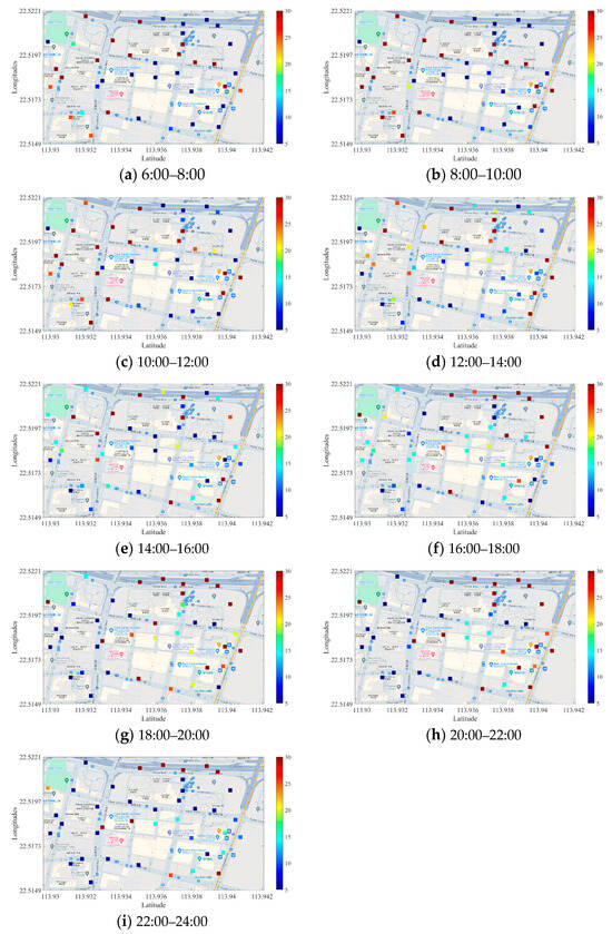For example, the demand for bike sharing varies across different areas and times, affecting the supply capacity of the e-fences. For instance, during the morning peak period (Figure 7a,b), the capacity of e-fences around residential areas (stations 1, 2, 4, 9, 19, 20, etc.) is higher to accommodate commuters. Similarly, the capacity near schools’ peaks between 6:00 and 8:00, coinciding with students’ commute times. Additionally, the morning train at Houhai Station at 5:55 requires that the capacity of the e-fences around subway stations meets the last-mile travel needs of subway commuters.