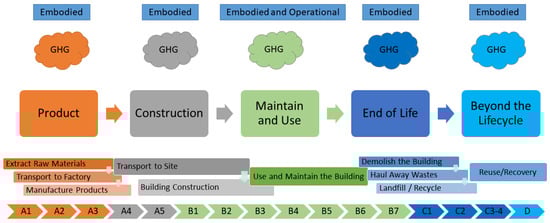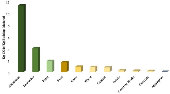 Buildings and infrastructure are commonly evaluated for their operational carbon emissions resulting from energy consumption during their lifetime. However, embodied carbon can be a significant portion of a project’s total carbon footprint and should not be overlooked. As illustrated in Figure 2, both operational and embodied carbon emissions are important; hence, the mitigation of both is crucial for achieving carbon neutrality and sustainability [,,,,]. While operational carbon emissions have traditionally been the focus of decarbonization strategies, embodied carbon emissions are gaining increasing attention due to their significant impact, particularly in modern buildings that are designed to be energy efficient and have a long lifespan. Reducing the embodied carbon emissions often involves selecting sustainable materials and construction methods, while reducing the operational carbon emissions focuses on improving energy efficiency and utilizing renewable energy sources. Both aspects are essential for achieving a comprehensive decarbonization strategy in the built environment. Also, embodied carbon has long-term implications (https://www.eia.gov/outlooks/ieo/ (accessed on 17 November 2023)). Once emitted, GHGs stay in the atmosphere for an extended period, contributing to global warming and climate change [,,,,,]. Figure 3 shows the varying levels of carbon emissions associated with different construction materials and constitute the embodied carbon emissions for buildings.