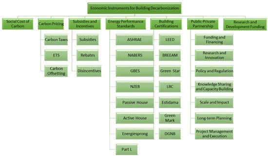 Reducing building carbon emissions requires a combination of economic instruments and strategies [,]. Figure 5 shows some effective economic instruments that can be utilized. It is important to note that Figure 5 provides a significant, yet not exhaustive, collection of these instruments, and may not include all possible cases of each intervention option.