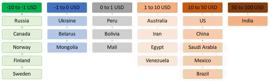 The global estimates of SCC hide significant variations in the country-level SCC (CSCC). In Figure 6, the country-level social cost of carbon dioxide emissions is depicted, illustrating the estimated financial impact (in USD per Tonne CO2) on different nations due to global warming. A value of zero indicates that the projected impact is negligible or minimal, while positive values suggest potential economic damages from climate change. Conversely, negative values indicate countries where there may be perceived economic benefits associated with global warming impacts. This analysis underscores the complex economic and environmental dynamics influencing carbon pricing strategies worldwide. Figure 6 illustrates the geographical pattern of CSCCs based on a baseline Socioeconomic Pathway (SSP) or Representative Concentration Pathway (RCP) scenario (SSP2-RCP6 with standard Burke, Hsiang and Miguel (BHM) specifications (2015)). Among countries, India exhibits the highest CSCC at USD 86 per Tonne CO2e (ranging from 49 to 157). The United States follows with USD 48 per Tonne CO2e (ranging from 1 to 118). Similarly, Saudi Arabia’s CSCC is USD 47 per Tonne CO2e (ranging from 27 to 86). Three other countries, Brazil, China, and the United Arab Emirates, have CSCCs above USD 20, USD 24, and USD 24 per Tonne CO2e, respectively. Certain regions, including Northern Europe, Canada, and Russia, display negative CSCC values due to their current temperatures being below the optimal economic level. These findings are particularly sensitive within the analysis, as all countries have positive CSCC under the BHM long-run. Although 90% of the global population has a positive CSCC, the magnitude of CSCC varies based on scenarios and discount rates, and the relative distribution remains generally stable despite these uncertainties [,,].