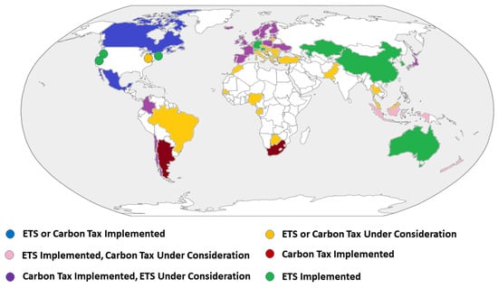 Implementing a carbon pricing mechanism, such as a carbon tax or Emissions Trading System (ETS), can provide incentive to building owners and developers to reduce their carbon emissions. By putting a price on carbon, it encourages the adoption of energy-efficient technologies and practices. Carbon pricing mechanisms are economic-based approaches designed to reduce GHG emissions [,]. Figure 7 provides a map of carbon pricing incentives in different regions and countries around the world. Below are three common types of carbon pricing mechanisms.