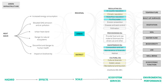 Although hubs and stepping stones are key elements for implementing UGI as climate adaptation systems, the urban-scale application of remote sensing technologies remains underexplored. To address this, in the final stage of our analysis, we focused our literature review on urban-scale methodologies and indicators, particularly considering the impacts of heat wave hazards and the urban heat island (UHI) phenomenon, which reduce the efficiency of UGIs in terms of ESs (Figure 2).