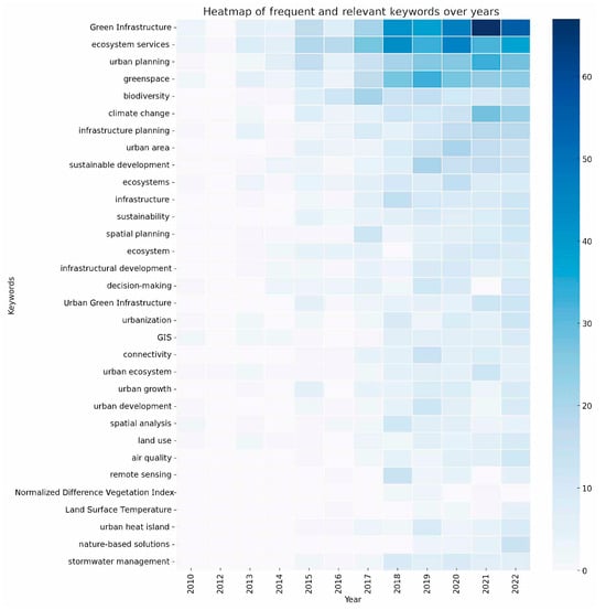 In the final phase of the keyword research process, it emerged that focusing on the keyword “heat wave” led to highly relevant results for remote sensing methodologies applied to UGI, including the occurrence of some multispectral indices widely used in the literature to analyze the response of UGI to heat wave effects, such as NDVI (Normalized Difference Vegetation Index) and LST (Land Surface Temperature). Moreover, since 2018, the results have significantly increased, indicating a high responsiveness of remote sensing technologies for climate adaptation during heat wave phenomena (Figure 7).