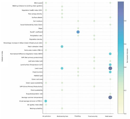 Land cover indicators, such as NDVI, provide insights into vegetation health and connectivity, which are crucial for managing urban heat waves and evaluating green areas’ effectiveness in cooling and temperature reduction. Ecosystem structure indicators, like habitat connectivity and landscape fragmentation, help identify critical areas for ecological interventions that promote biodiversity and resilience. Land use indicators inform strategic planning by classifying urban land into residential, commercial, and industrial areas, facilitating targeted UGI benefits. Social and well-being indicators, including population density and socio-economic distribution, can be integrated with environmental data to identify heat wave-vulnerable areas, ensuring policies meet local community needs. Ecosystem condition indicators, such as vegetation health and soil pollution, are used to monitor the overall state of urban ecosystems, guiding restoration and management strategies. Lastly, environmental indicators, including surface temperature and air quality, are used to assess UGIs’ impacts on the urban microclimate, highlighting their role in reducing temperatures and improving air quality for healthier urban environments.