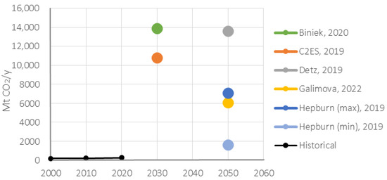 Despite frequent mentions of CO2 utilization technologies in the academic literature and reports from international agencies addressing climate change issues, quantitative forecasts regarding the long-term development of CCU are rarely encountered in studies [34,35]. This scarcity can be attributed primarily to the direct relationship between the pace of technological development and the cost of renewable energy sources. Moreover, existing models simulating various CCU options are often low-granularity models [36]. Experts and researchers providing quantitative forecasts for the volume of CO2 capture for manufacturing typically base their assessments on CO2 demand, partly derived from the volume of markets for analogous goods made from fossil fuels, with limited consideration given to the pace of CCU technology development and other influencing factors (Figure 1).