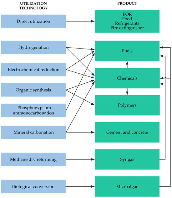 The utilization of carbon dioxide as a raw material is a conventional practice in certain industries. Potential CO2 utilization methods include both its direct consumption and its conversion into products with high added value. Presently, CO2 finds commercial application not only in CO2-EOR but also in various other sectors, including the food industry (as a refrigerant), carbonated drink production, fire extinguishing systems, mechanical engineering, medicine, and agriculture [42]. However, it is important to note that in most of these applications, CO2 is not isolated from the Earth’s carbon cycle due to the short lifespan of the product [32].