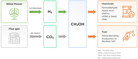 Considered the most promising among solutions for CO2 utilization in existing forecasts, the production of fuels stands out as the primary method for reducing emissions in hard-to-abate sectors. Currently, one of the processes nearing large-scale commercial implementation is the synthesis of methanol from H2 and CO2. Methanol serves as both an energy carrier and an intermediate product in petrochemical synthesis, known for its convenience in storage and transportation [49]. However, for the methanol produced via this method to be classified as carbon-neutral, it necessitates the use of H2 obtained through water electrolysis, with the requisite energy sourced from renewable energy sources.