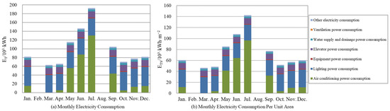 Since the university’s catering buildings are a crucial part of the campus building complex, energy conservation is very concerned with how much electricity they consume. A canteen building may be small in size, yet it consumes ten to twenty times as much energy as a typical residential home. For this reason, developing a practical energy supply system is essential to reducing emissions and saving energy. The monthly simulation results for the college dining hall’s electrical load are displayed in Figure 4. Air conditioning and lighting systems consume about 81% of the building’s yearly power usage, according to statistics. The highest and lowest monthly building energy consumption are 63.07 × 103 kWh and 192.50 × 103 kWh, and the air conditioning system had the highest energy consumption in July. The average monthly building energy consumption is 99.82 × 103 kWh. The calculated sum of various energy consumption (cooling and heating loads, lifts, lighting, natural gas, etc.) in the student canteen for the whole year is 2.39 × 106 kWh.