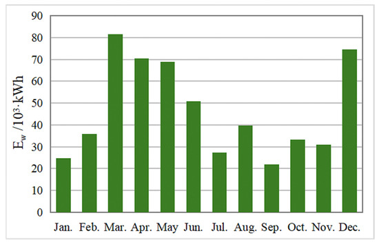 By integrating the power output curves and real wind velocity, the power generation Ew was assessed in Figure 8, revealing an annual total of 0.56 × 106 kWh. The highest power generation is in March, which is springtime in northern China, with frequent sandy and dusty weather and generally higher-than-usual wind speeds, making the wind farm’s capacity the highest of the year, with a specific value of 0.08 × 106 kWh. The next highest power generation is in December, which is winter in China, and although wind speeds are not as high as in the spring when sand and dust are common, the low temperatures increase the density of the air, which is favorable for wind power generation, and therefore the capacity is also considerable, with a value of 0.075 × 106 kWh.