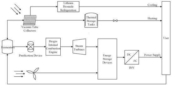 As shown in Figure 9 and Figure 10, two energy supply schemes are designed in this paper. Strategy 1: Energy complementarity through biomass, light, and wind energy. The fermentation of kitchen garbage results in the production of biogas, which is then burned to generate electricity using a steam turbine. This process can produce up to 1.3 × 106 KWh of power annually. Light energy is collected using vacuum tube collectors to provide year-round heating, cooling, and domestic hot water supply. There are 10,620 collectors in 354 groups, and the annual heat collection capacity can reach 0.606 × 106 kWh. Wind energy is collected using 1.5 MW wind turbines, and the annual wind power generation capacity can reach 0.56 × 106 kWh based on survey data. To prevent wind and light resource instability, the system uses energy storage devices to store excess electricity, provides energy on cloudy and rainy days or in windless weather, and uses a solar energy absorption lithium bromide unit for refrigeration. In the summer, the cooling capacity can reach 0.181 × 106 kWh. The first strategy’s operating system is displayed in Figure 9. The process is as follows: