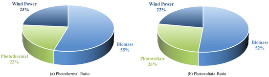The calculated capacities of the two sets of systems differ, with the sum of the effective capacities of Strategy 1 being 2.375 × 106 kWh, and the combined effective capacities of Strategy 2 being 2.52 × 106 kWh. Figure 11 shows the capacity share of the various energy sources, and it can be seen that the share of photovoltaics is 26% larger than that of solar thermal (22%).