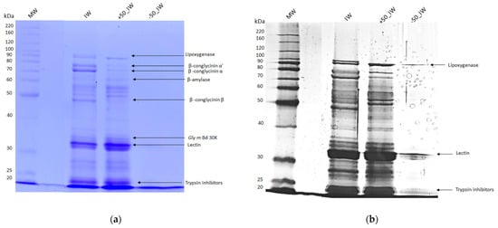 Figure 3 displays the SDS-PAGE profile of protein fractions of the industrial whey samples. Samples IW and +50_IW in Figure 3a represent the industrial whey before filtration and its retentate after filtration, respectively. It is possible to identify, on both, characteristic bands of the α, α’, and β subunits of β-conglycinin (72 kDa, 76 kDa, and 53 kDa), as well as a band of approximately 34 kDa, which may correspond to the Gly m Bd 30K compound accompanying the 7S fraction. Furthermore, the presence of bands at 100 kDa, 60 kDa, and 33 kDa may indicate the presence of the characteristic whey proteins lipoxygenase, β-amylase, and lectin subunits. Bands of approximately 20 kDa, in turn, may indicate the presence of the 2S fraction represented by the Kunitz trypsin inhibitor. Similar labeling was made by Zarkadas et al. [29] while working on the identification of storage proteins in samples of different soybean genotypes.