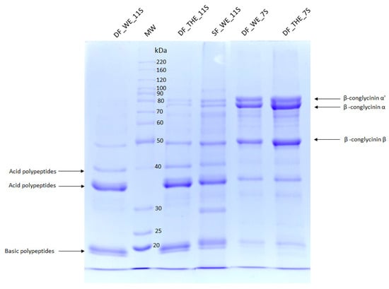 SDS-PAGE gel with lanes (DF_WE_11S): 11S fraction from water extraction of defatted flakes, (MW) molecular weight; (DF_THE_11S) 11S fraction from Tris-HCl extraction of defatted flakes, (SF_WE_11S) 11S fraction from water extraction of spent flake; (DF_WE_7S) 7S fraction from water extraction of defatted flakes; and (DF_THE_7S) 7S fraction from Tris-HCl extraction of defatted flakes.