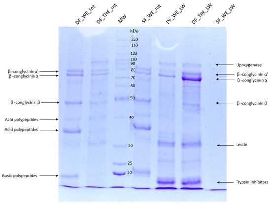 SDS-PAGE gel with lanes: (DF_WE_Int) intermediate fraction from water extraction of defatted flakes; (DF_THE_Int) intermediate fraction from Tris-HCl extraction of defatted flakes, (MW) molecular weight; (SF_WE_Int) intermediate fraction from water extraction of spent flakes; (DF_WE_LW) laboratory whey fraction from water extraction of defatted flakes; (DF_THE_LW) laboratory whey fraction from Tris-HCl extraction of defatted flakes; and (SF_WE_LW) laboratory whey fraction from water extraction of spent flakes.
