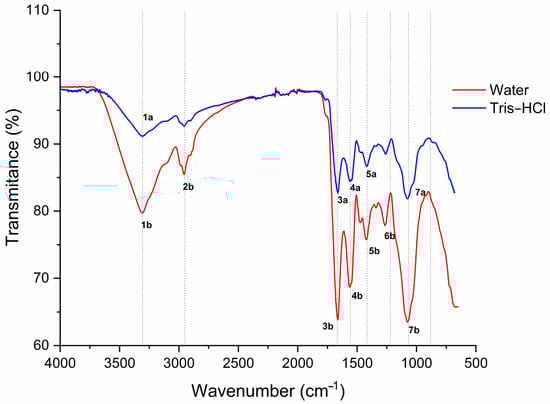 The peaks in the spectrum resulting from the Tris-HCl extraction experiment consistently showed higher transmittance values than those from the water extraction method. This indicates greater absorption and, consequently, a higher amount of residual protein in samples extracted with water, suggesting less efficient protein recovery. These data reinforce the assumptions previously described regarding the comparison of the efficiency of the two extraction methodologies.