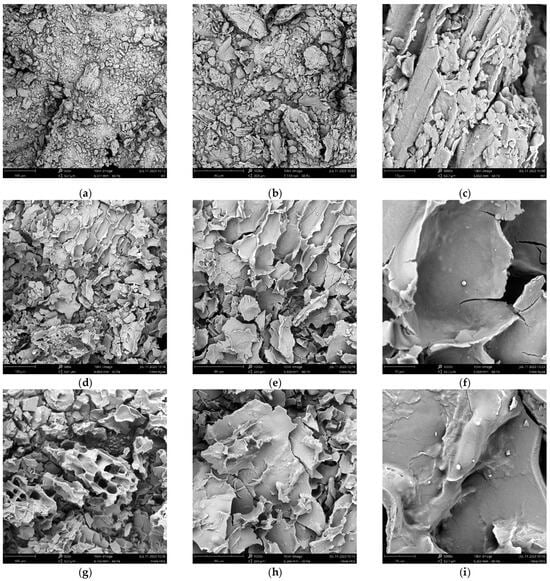 SEM images: (a) soybean defatted flakes at 500× magnification, (b) defatted flakes at 1000× magnification, (c) defatted flakes at 2500× magnification, (d) solid residue of water extraction defatted flakes at 500× magnification, (e) solid residue of water extraction defatted flakes at 1000× magnification, (f) solid residue of water extraction defatted flakes at 2500× magnification, (g) solid residue of Tris-HCl extraction defatted flakes at 500× magnification, (h) solid residue of Tris-HCl extraction defatted flakes at 1000× magnification, (i) solid residue of Tris-HCl extraction defatted flakes at 2500× magnification.
