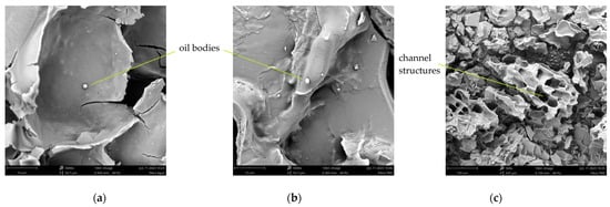 The SEM images of the samples at three different magnifications are presented in Figure 7. In the SEM images of soybean defatted flakes (Figure 7a–c), it is possible to observe bodies with an approximately cylindrical shape deposited on flat fragments. Bodies with a similar shape in soy flour samples were identified as protein bodies by Xing et al. [33].