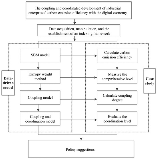In the article, a logic method of data-driven was developed. Through processes such as data collection, processing, and modeling, we proposed actionable policy recommendations. In this study, the super-efficiency slack-based measure (SBM) model was employed to objectively assess industrial enterprises’ carbon emission efficiency, ensuring a more precise and unbiased evaluation. The entropy weight method was employed to empower and assess the digital economy’s advancement level, eliminating errors caused by the inconsistency of index dimensions, and evaluating the coordinated development degree by establishing coupling-coordination degrees. Based on these findings, suggestions were proposed to foster the coupling and coordinated advancement of the two. The sequential steps of this methodology are illustrated in Figure 1.