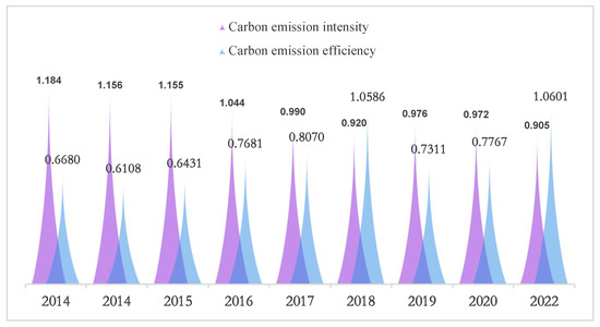 Carbon emission intensity and efficiency of Anhui China between 2014 and 2022. The original data came from the Anhui Provincial Statistical Yearbook. Equations (1), (2), and (11) were used to calculate the data shown in this figure.