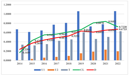 Results of U1, U2, CL, T, and D in Anhui from 2014 to 2022. The original data came from the Anhui Provincial Statistical Yearbook. Equations (13)–(15) were used to calculate the data shown in this figure.