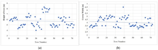 Street tree data, including height, width of the crown, plant spacing, and other related variables, were counted. The data are shown in Figure 6. The tree height, crown width, plant spacing, height-to-crown ratio thresholds, and medians were then determined. The data are shown in Table 2. The refined data serve as the foundational parameters for the 3D modeling of street trees, which enhances the experiment’s viability and scientific validity by more precisely reflecting the traits of nearby street trees.