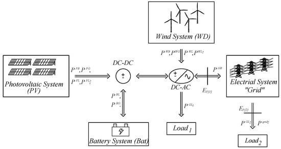 Configuration of a photovoltaic–wind–battery generation system, considering two loads, connected to the grid.